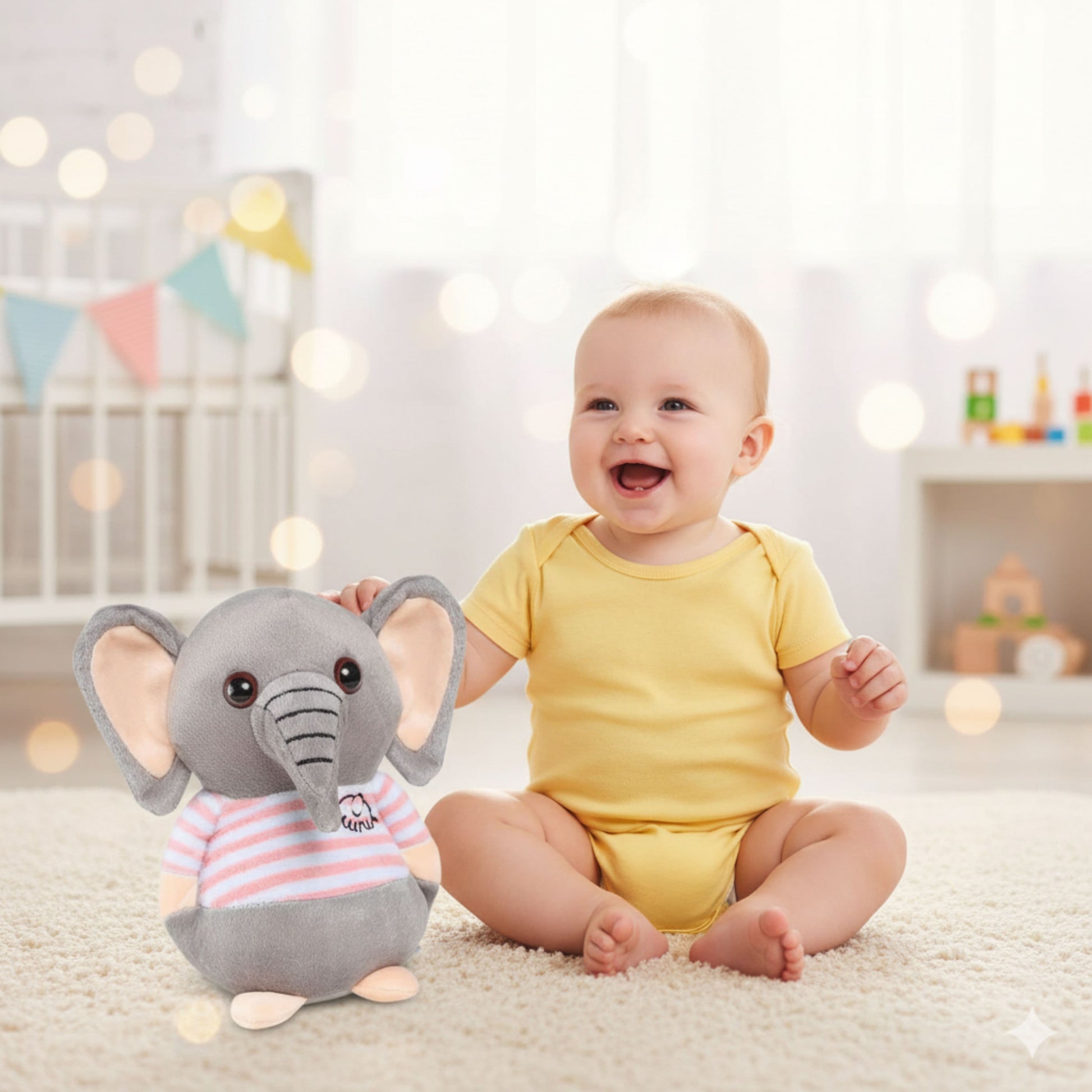 Cute little elephant is dressed and ready for fun and snuggles! With its irresistibly round shape, large expressive eyes, and charming pink-and-white striped shirt, this plush toy is destined to be your baby's new favorite companion. It’s the perfect blend of unique design and cozy comfort.